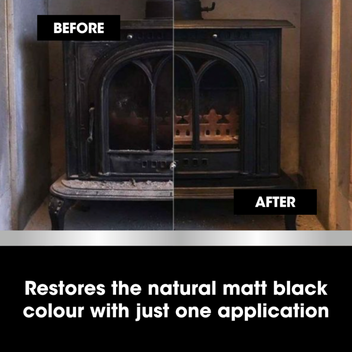 - Pasul 2: Aplicați restauratorul. Înmuiați un burete moale în Stove Restorer și frecați-l uniform pe metal. Veți observa cum culoarea neagră mată, bogată, este restaurată instantaneu.