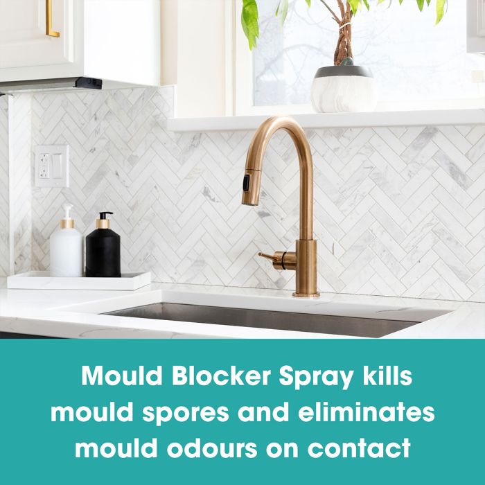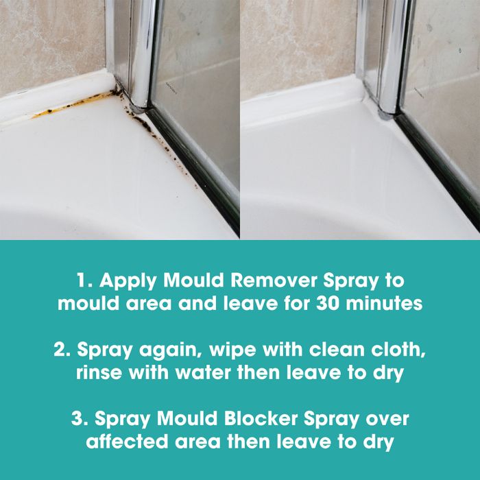 Pasul 1: Curățați cu spray-ul antimucegai. Spray-ul nostru antimucegai îndepărtează rapid și eficient mucegaiul și petele negre de pe băi, bucătării, tavane, gresie, rosturi, silicon și pereți. De asemenea, îndepărtează mirosurile neplăcute de umezeală și mucegai. Formula sa pe bază de înălbitor oferă rezultate vizibile în doar 30 de minute .