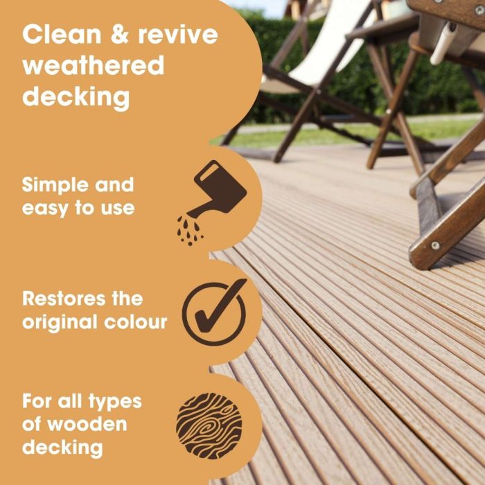 Terasele din lemn pentru exterior sunt expuse constant la umezeală și soare, ceea ce le face să devină gri, să acumuleze grăsime și să dezvolte pete verzi. Soluția noastră de curățare pentru terase are o formulă avansată cu acțiune dublă, concepută pentru a curăța în profunzime și a revigora lemnul deteriorat, redându-i culoarea și vibranța originală.