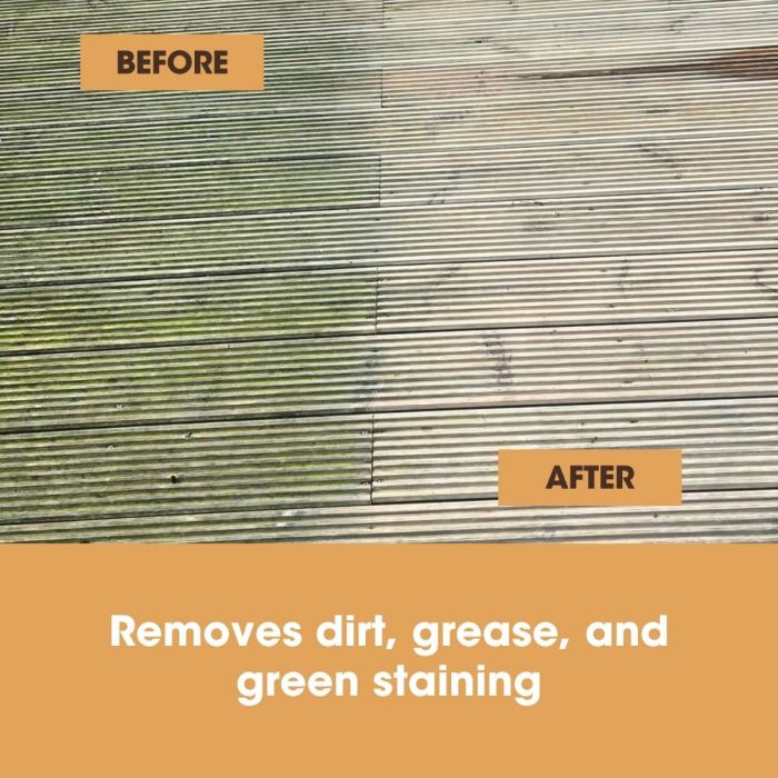 - Pentru zonele încăpățânate: Pulverizați zona afectată cu un detergent curat și lăsați să acționeze timp de 3 zile. În acest timp, Decking Cleaner va distruge microorganismele în profunzime, transformându-le într-o pulbere uscată pe care o puteți apoi îndepărta cu ușurință prin măturare sau spălare.